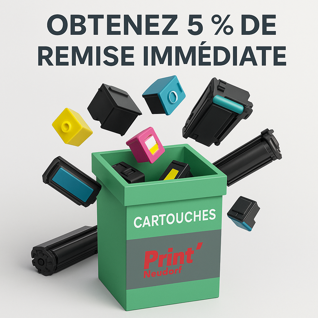 ✅ Bénéficiez de 5 % de remise immédiate sur l’achat de vos consommables d’impression et contribuez à la réduction des déchets plastiques grâce au recyclage de vos cartouches et toners vides.